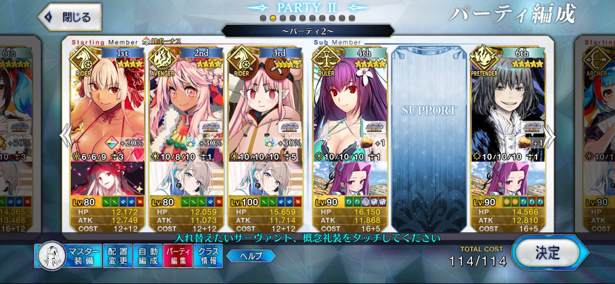 水着鈴鹿(宝具3)、モルガン(レベル120宝具4)、水着スカディ、フレンドのオベロン、で6積みは出来た