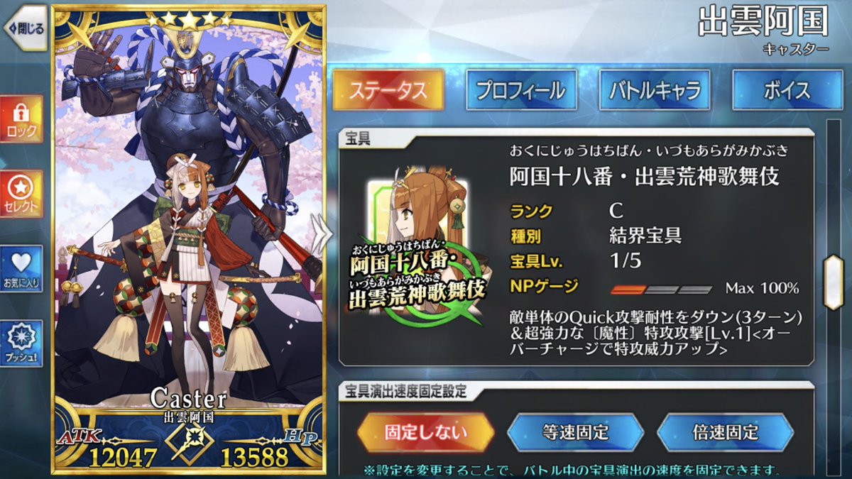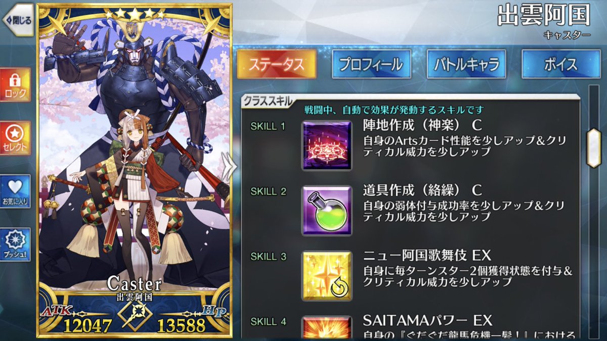 【FGO】封印の巫女はNP50チャージ!出雲阿国のスキル・宝具まとめ サーヴァント関連 Twitter Facebook0 Pocket0 LINE 2021.11.17 出雲阿国のスキル・宝具 出雲阿国「阿国十八番・出雲荒神歌舞伎(おくにじゅうはちばん・いづもあらがみかぶき)」