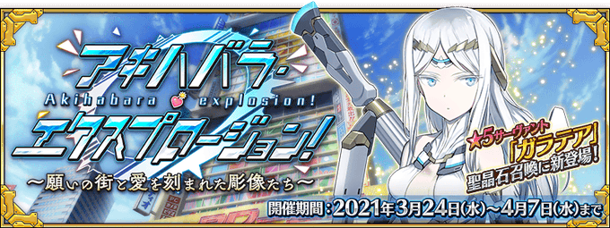 【予告】2021年3月24日(水)18:00より期間限定イベント「アキハバラ・エクスプロージョン! ~願いの街と愛を刻まれた彫像たち~」開催予定!お知らせ内にイベントの詳細を公開しておりますので、ぜひご覧ください!詳しくは→https://t.co/0TCSAlBBTX #FGO pic.twitter.com/QQlS67CmUz— 【公式】Fate/Grand Order (@fgoproject) March 22, 2021
