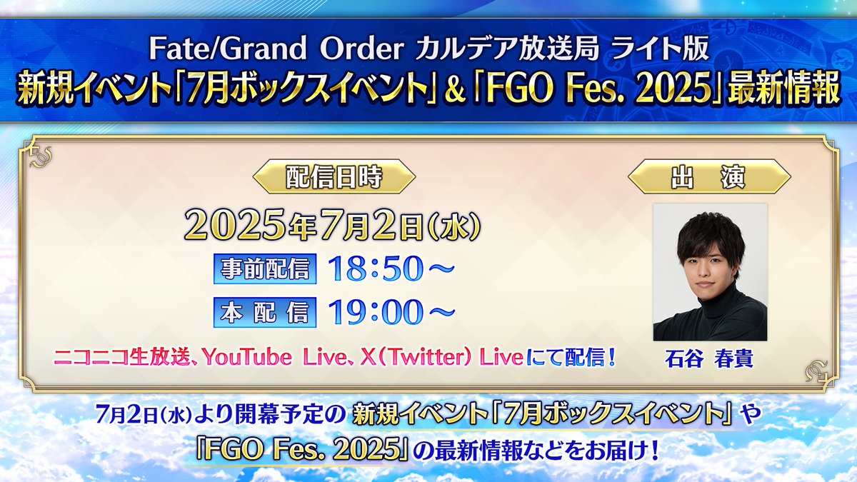 石谷春貴さんをお迎えして、7月2日(水)より開幕予定の新規イベント「7月ボックスイベント」や、「FGO Fes.… pic.twitter.com/Tm9LrRzGAm— 【公式】Fate/Grand Order (@fgoproject) June 25, 2025