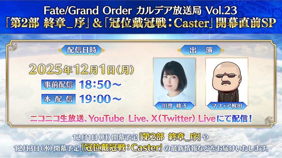 2025年12月1日(月)に『Fate/Grand Order カルデア放送局 Vol.23「第2部 終章_序」&「冠位戴冠戦:Caster」開幕直前SP』が配信