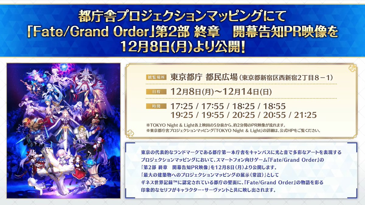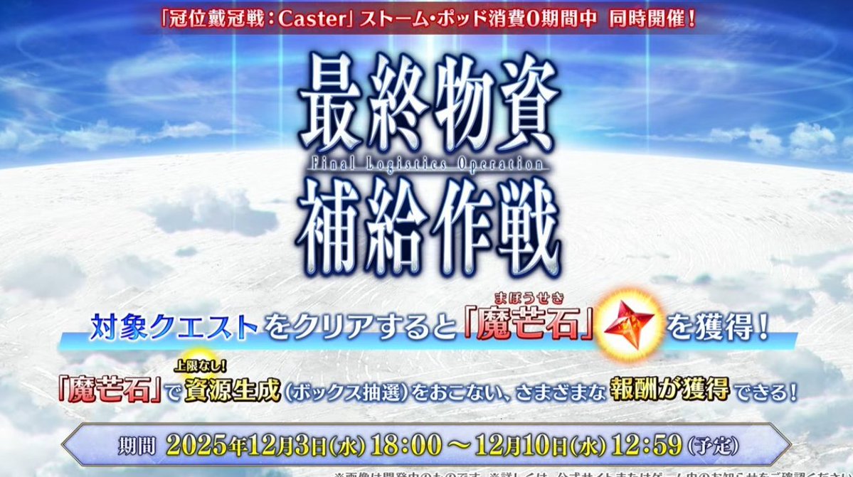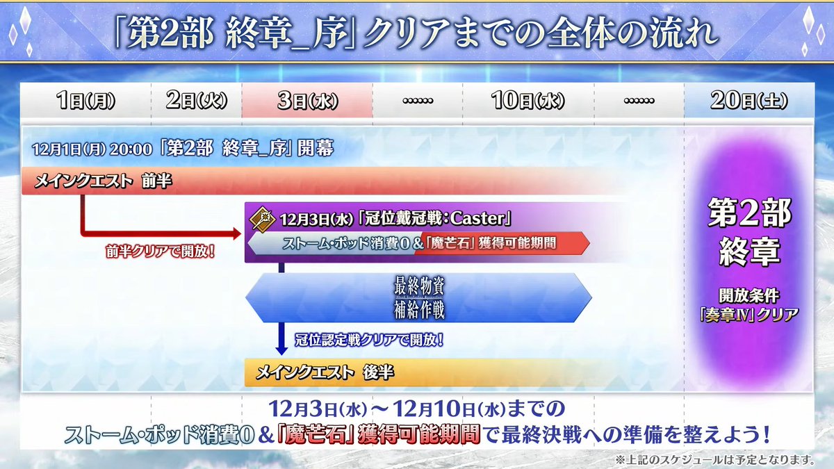 「Fate/Grand Order カルデア放送局 Vol.23「第2部 終章_序」生放送の内容まとめ 公式情報 X Facebook0 LINE 2025.12.01 ◆番組タイトル◆ 『Fate/Grand Order カルデア放送局 Vol.23「第2部 終章_序」&「冠位戴冠戦:Caster」開幕直前SP』 ◆配信日時◆ 2025年12月1日(月) 事前配信 18:50~ 本配信 19:00~ ◆YouTube Live◆ インフォメーションコーナー 本日のラインナップ ゲーム最新技術