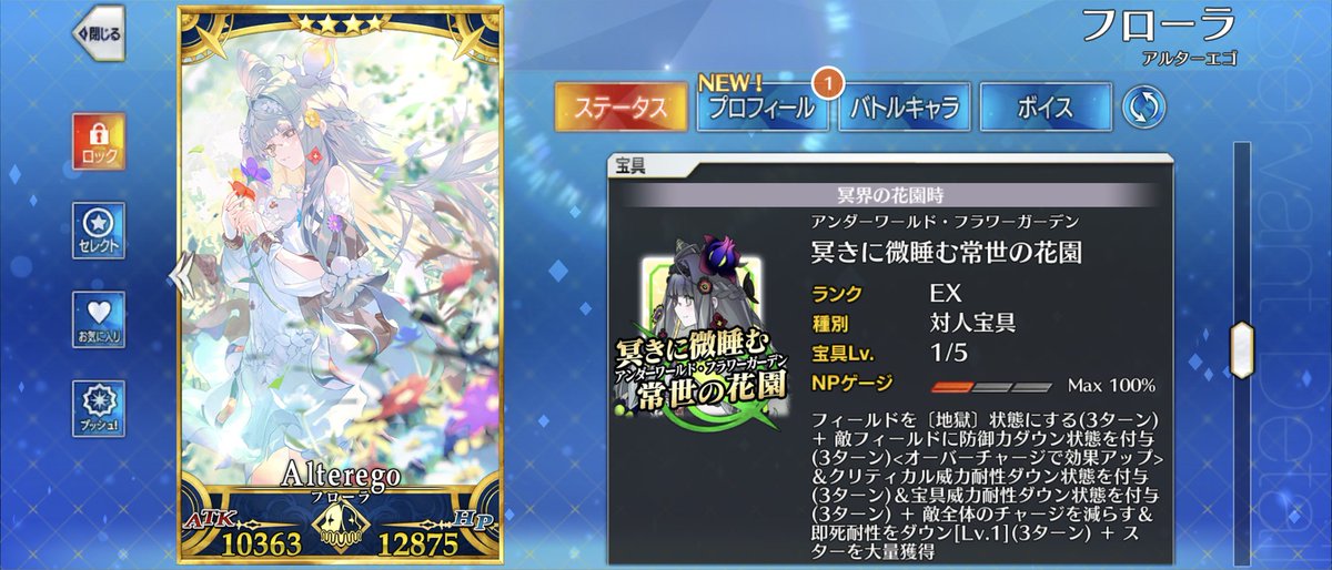 味方全体に宝具使用時のチャージ段階を1段階引き上げる状態を付与(1回・3ターン)&NPを20%増やす + 自身に「毎ターン味方全体に宝具使用時のチャージ段階を1段階引き上げる状態を付与(1回・3ターン)する状態」を付与(3ターン)&〔冥界の花園〕状態に変身させる<宝具が変化・解除不能>(5ターン)【通常状態のままにするか〔冥界の花園〕状態に変身させるか選択可能、〔冥界の花園〕状態の時は通常状態選択で変身を解除】