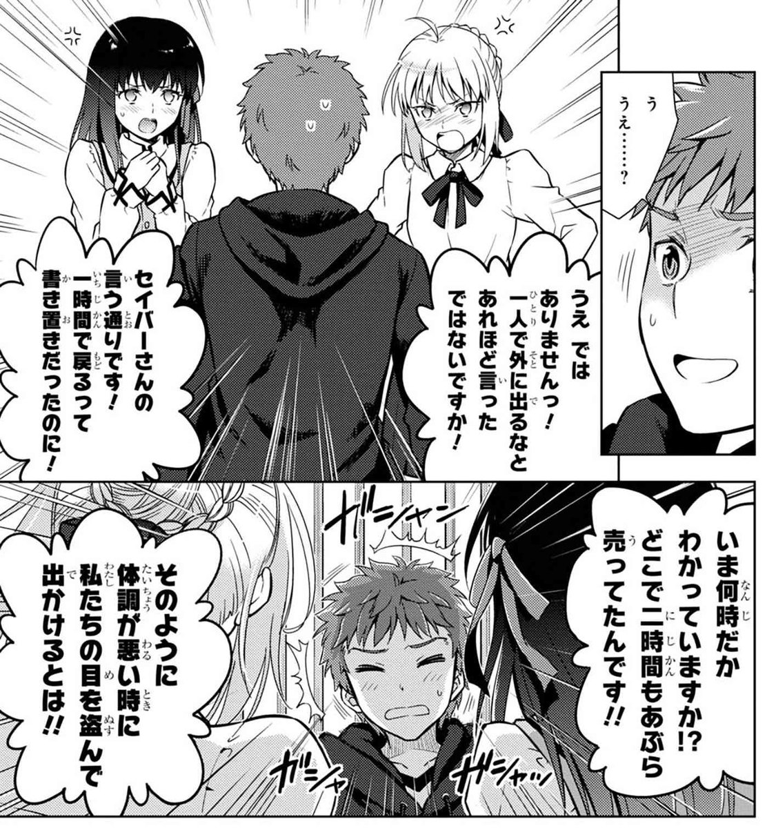 イリヤとのおしゃべりを終えて帰宅した士郎。当然、セイバーと桜は病み上がりの士郎を心配していて…?https://t.co/th1qoehfiJ