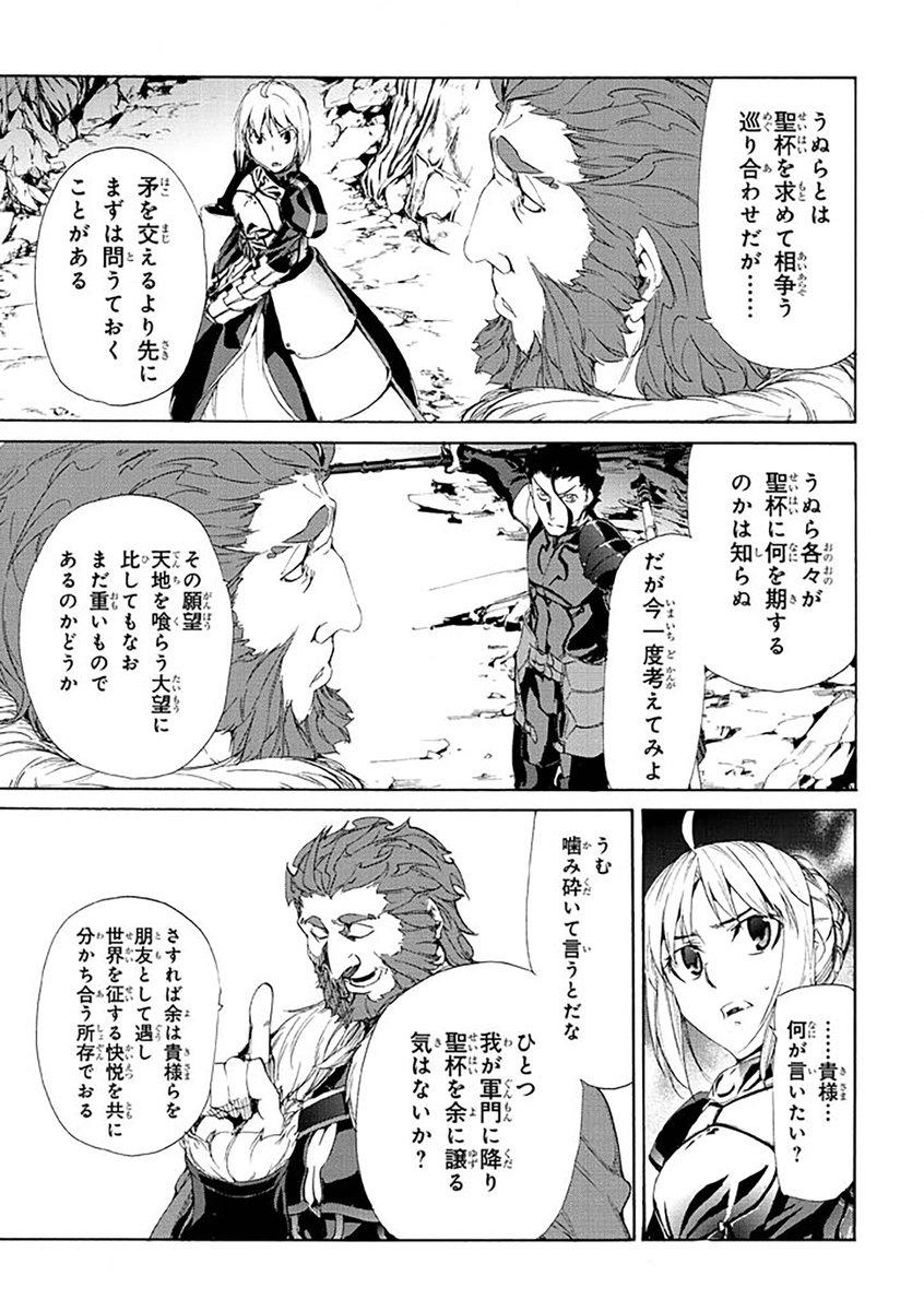 セイバーとランサーの勝負に、いきなり割って入ったライダー。声高らかに真名を名乗り…?